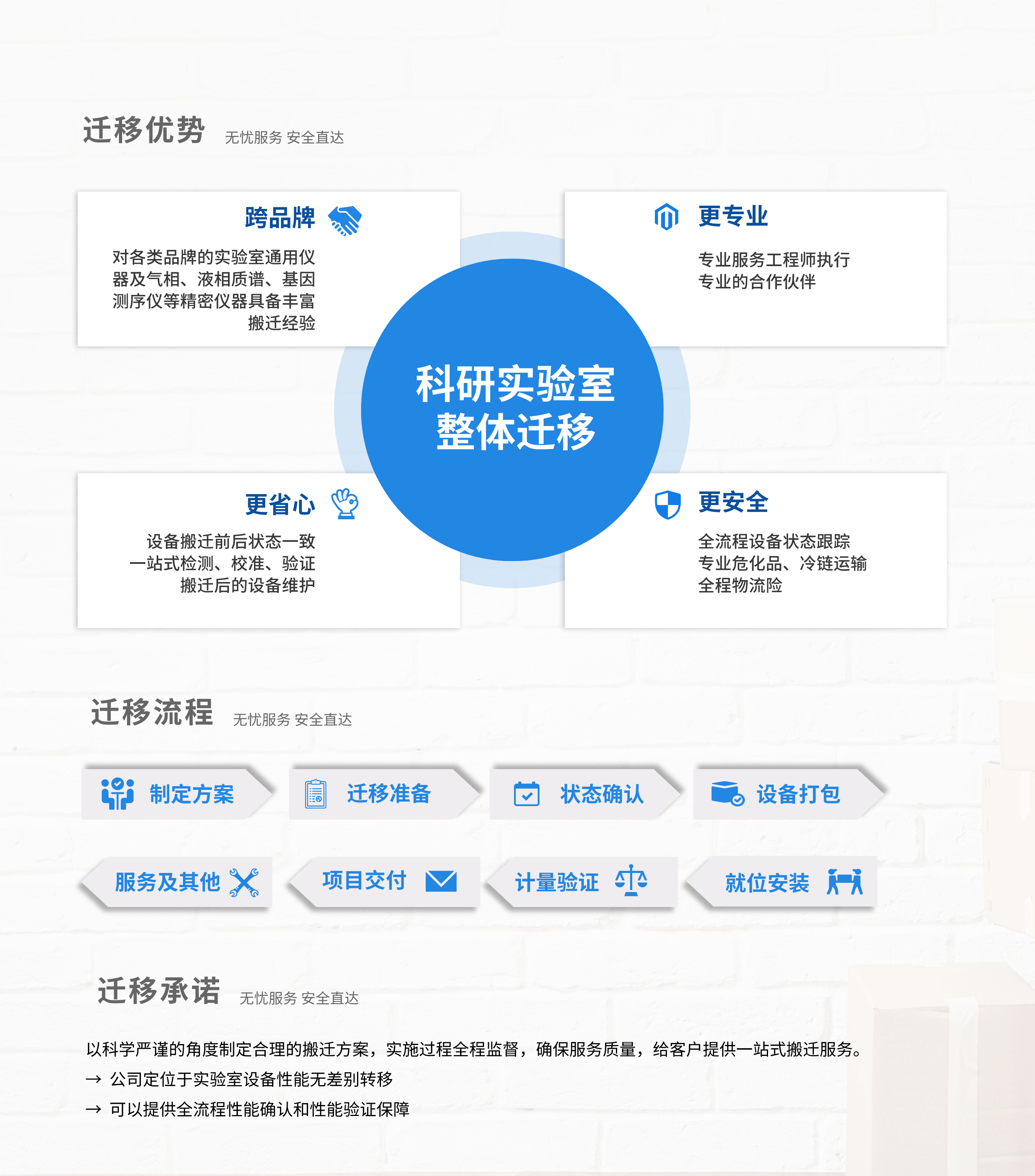 贝普检测实验室迁移解决方案,以专业、高效和定制化为核心,为客户提供全方位的实验室搬迁服务。我们拥有资深团队,精准评估设备特点,制定详细迁移计划,确保设备在运输过程中的安全性和稳定性。我们根据用户端实际环境条件和仪器特性,量身定制搬迁方案,覆盖搬前、搬中、搬后各个环节,保障实验室迅速恢复正常运行。对于特殊需求的实验室,我们同样能提供定制化解决方案,满足您的特殊要求。选择贝普,让实验室迁移更加简单、高效、安全。
